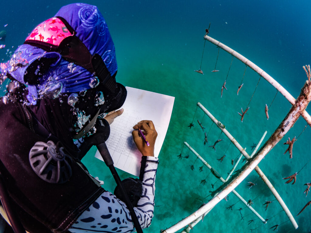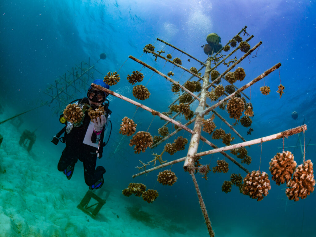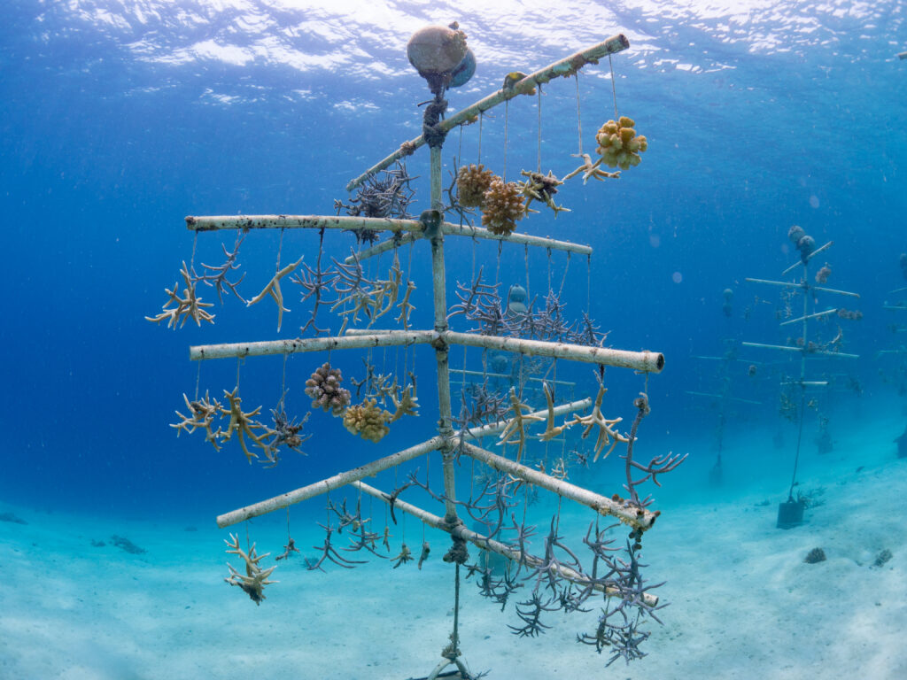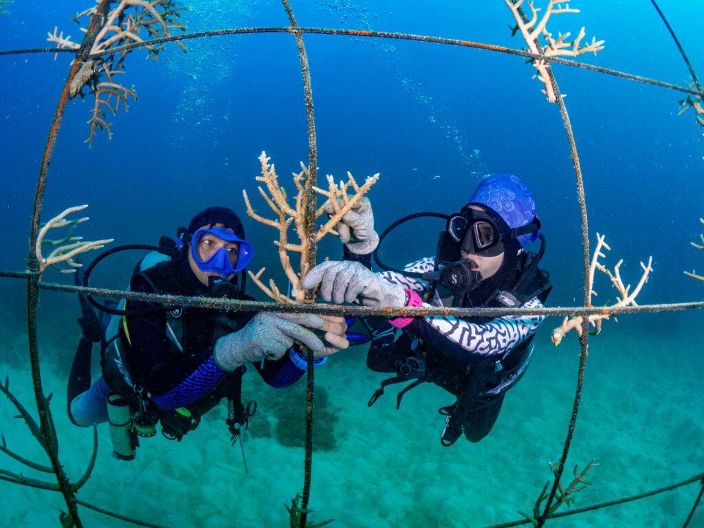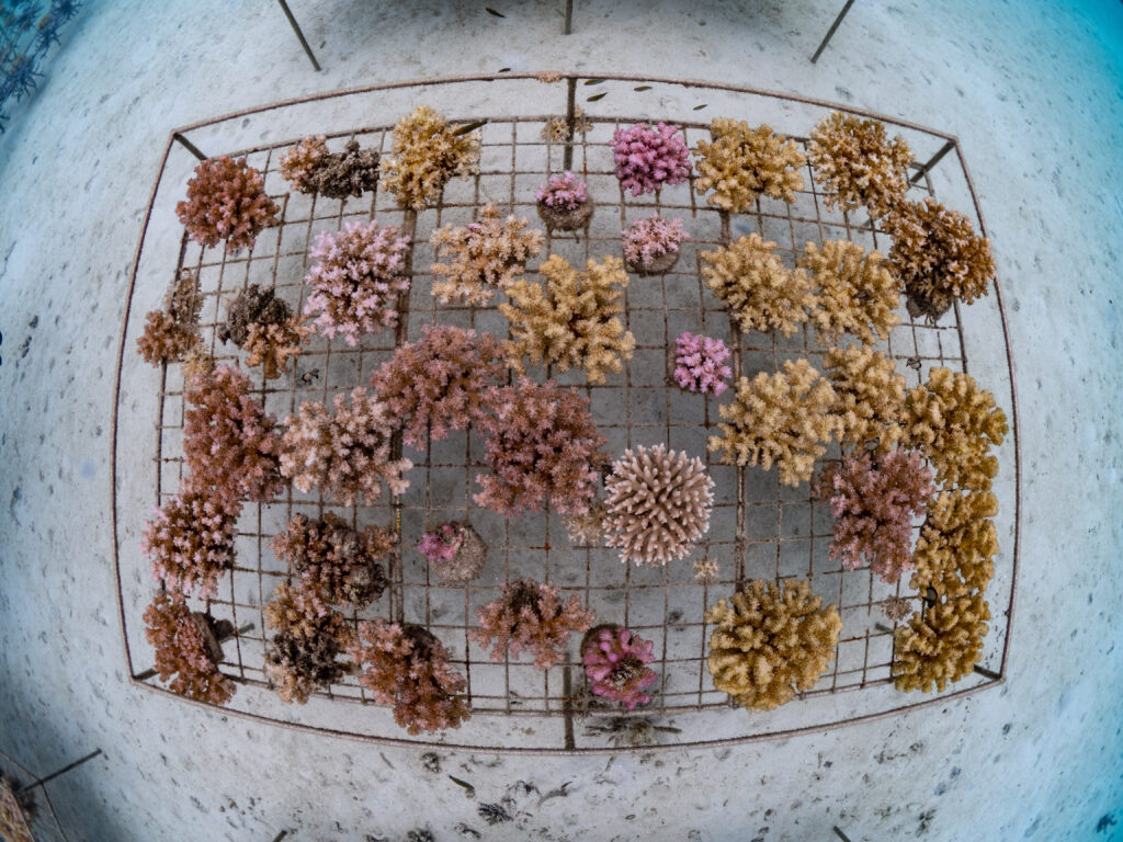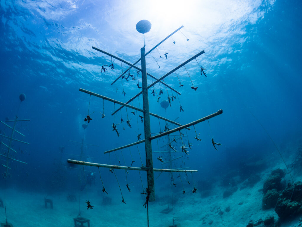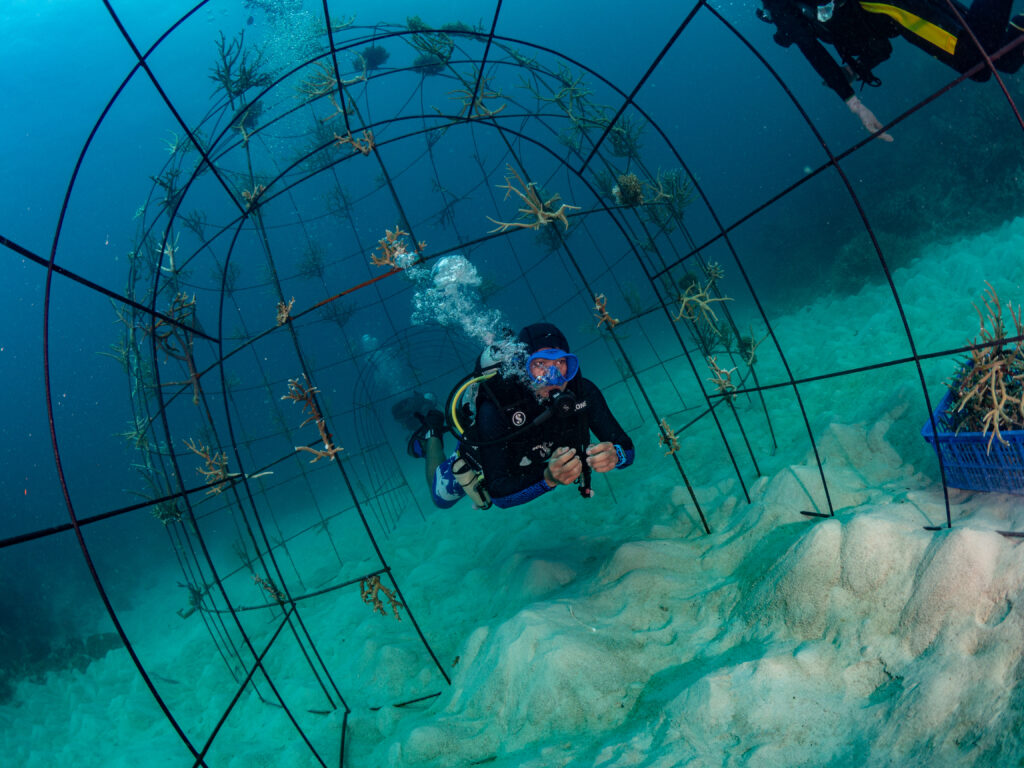 We created nursery sites for baby corals to grow quickly to a size where they can then be transplanted to areas of destroyed reefs.